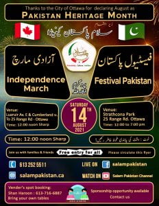 Special request: Please wear Pakistan/regional dress in the event and throughout August, bring your own Pakistani/Canadian flags, follow all COVID-19 S.O.P’s , keep 6 feet distance.