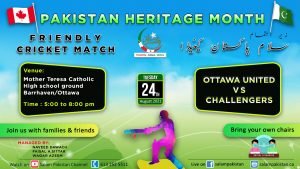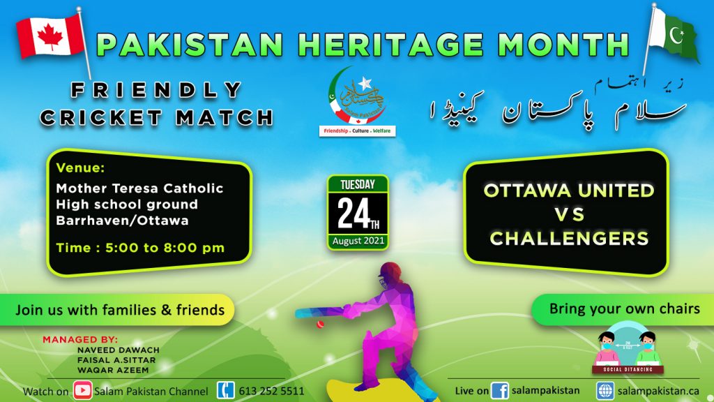 Upon special request by Team Salam Pakistan Canada, Our community friends, Janab Naveed Dawach Sahib, Janab Faisal Abudul Sittar Sahib and Janab Waqar Azeem Sahib organized a friendly cricket match to celebrate Pakistan Heritage Month. Details of thrilling friendly cricket match is as follow: