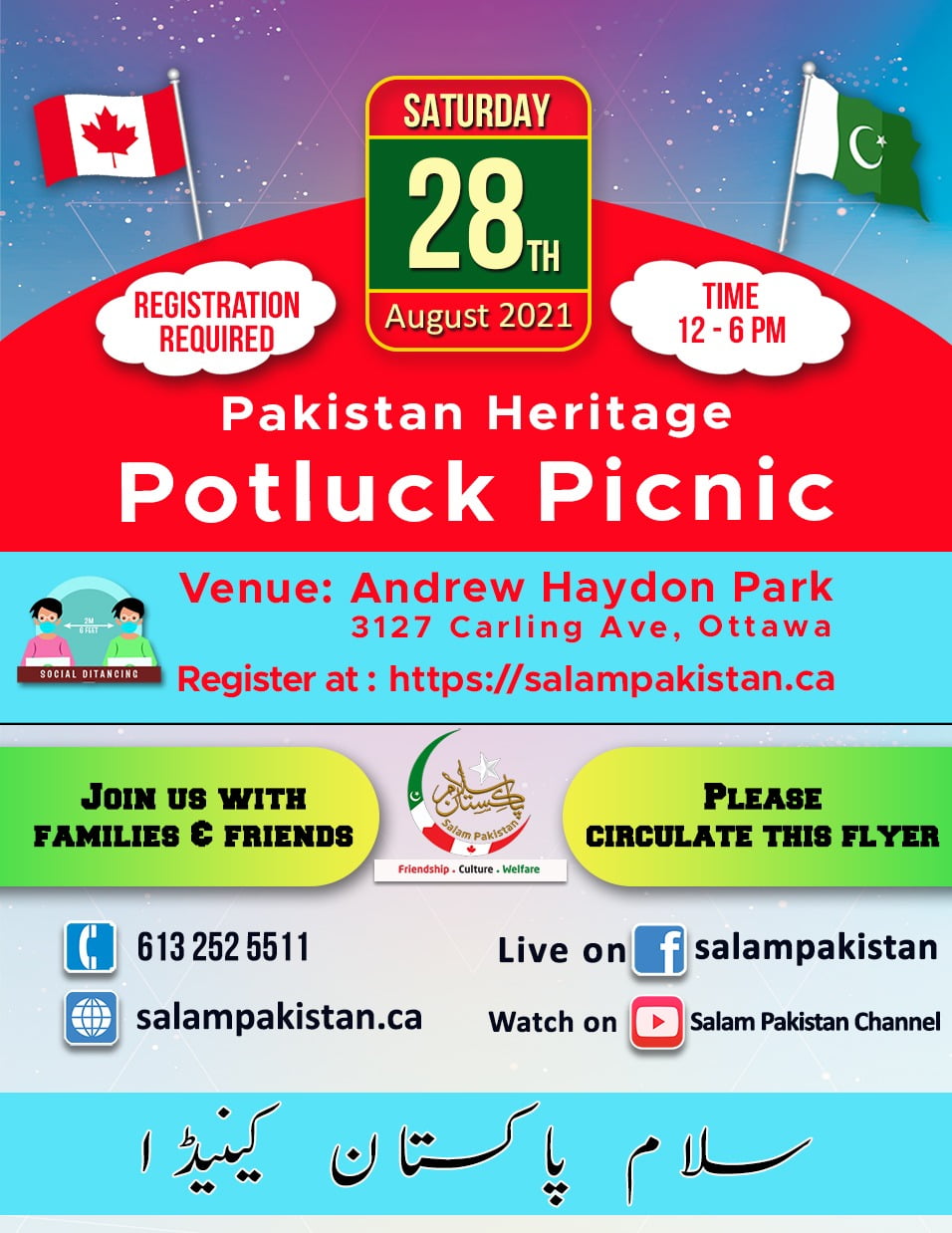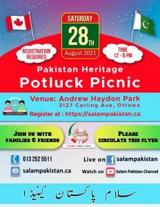 Ottawa’s leading community organization, Salam Pakistan Canada, please to announce that Pakistan Heritage Potluck Picnic registration is open for everyone now. Request to register your self, invite others to register, circulate/share flyer & email with others. Here is detail about venue & date: https://salampakistan.ca/event-registration/#registration_form