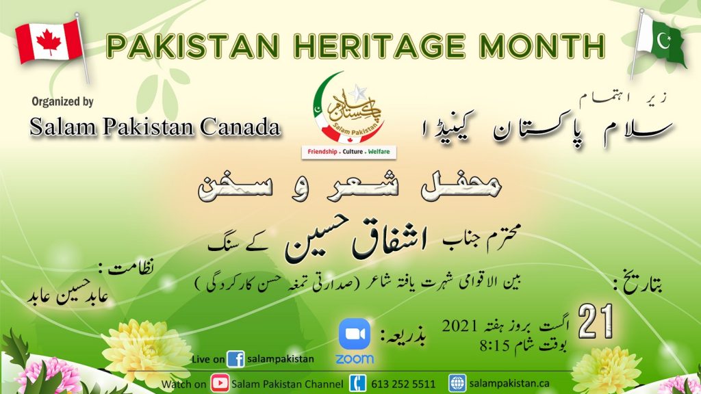 us online محفل شعر و سخن via zoom and FB live. World renowned poet/author, presidential pride of performance, Hon. Ishfaq Hussain sahib will be among us. Salam Pakistan Canada organized this programme to celebrate Pakistan Heritage Month. Request to join us, circulate this message and attached flyer. Here is link to zoom: